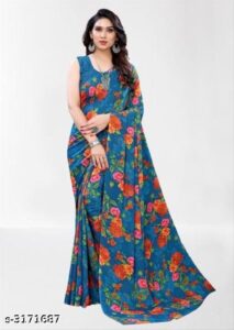Turn heads with this vibrant blue saree adorned with bold floral prints. Crafted from soft, lightweight fabric, it’s perfect for festive occasions and parties. The sleeveless blouse complements the colorful design, making this saree a standout addition to your ethnic wardrobe.