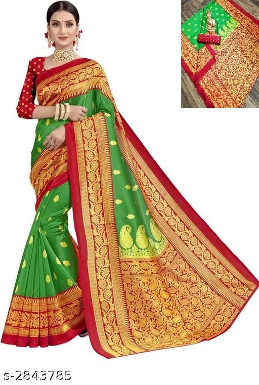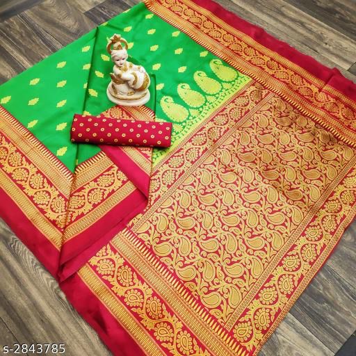 Make a stunning impression with this gorgeous green traditional saree, adorned with intricate golden and red border designs. Perfect for festive occasions or cultural events, this saree offers a rich and sophisticated look, while the quality fabric ensures comfort and style. Pair it with your favorite jewelry for a complete ensemble.